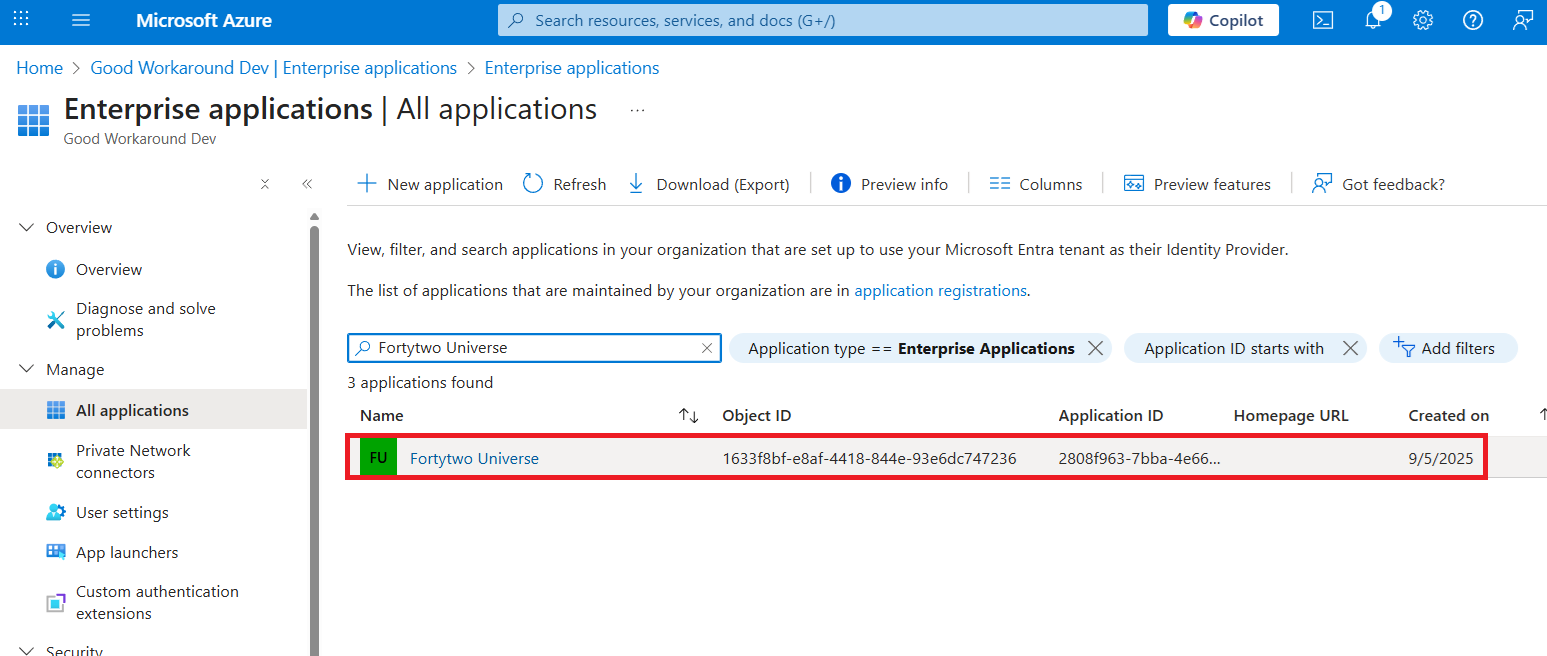 Locate the Fortytwo Universe app under Entra ID and Enterprise Apps: