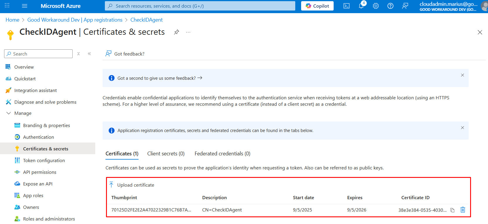 - Under Certificates & secrets upload the certificate file created in Step 2