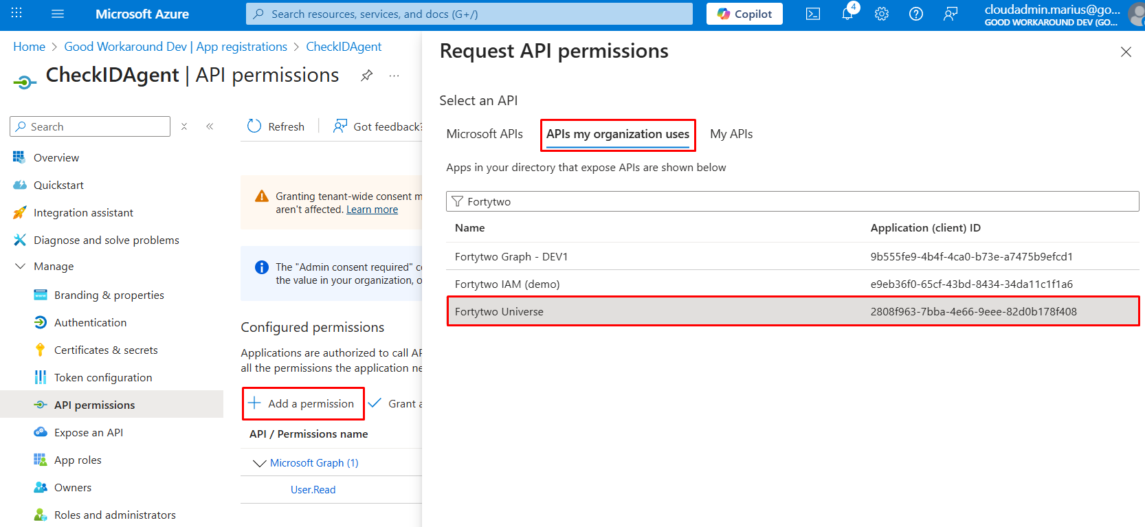 - Under API permissions, click Add a permission, select APIs my organization uses and locate Fortytwo Universe