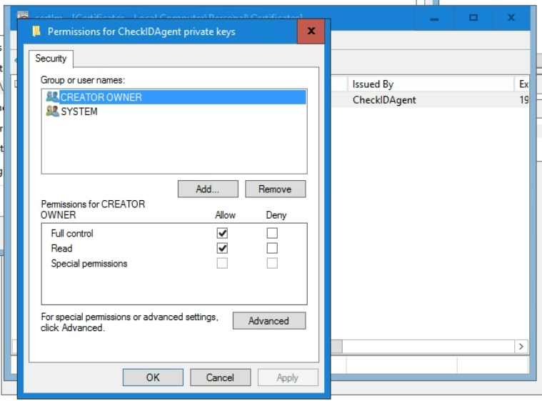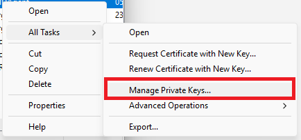 Run certlm.msc, locate the changeemail certificate under Personal certificates, and Manage private keys