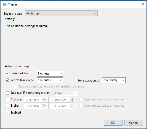 - Repeat every 5 minutes indefinitely (in order to restart the agent if it fails)