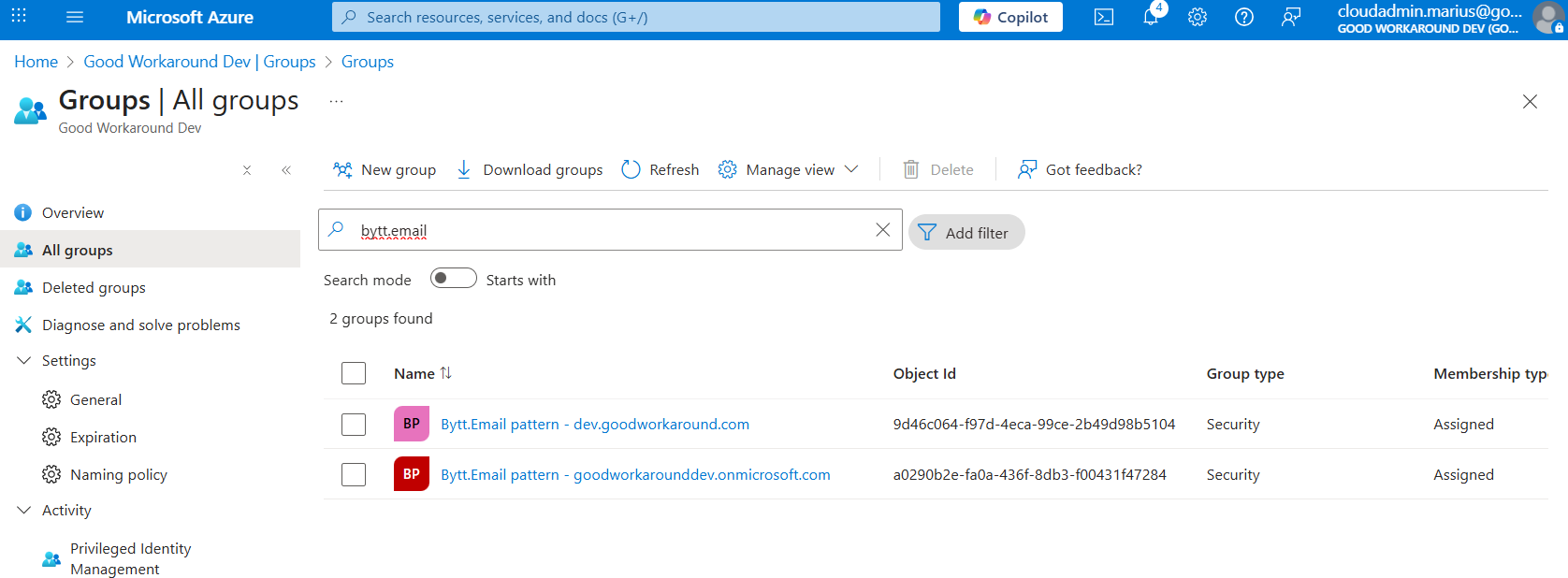 The script have created a set of groups, all prefixed with Bytt.Email pattern: