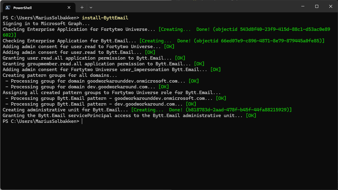 Install-Module Microsoft.Graph.Authentication, Microsoft.Graph.Applications, Microsoft.Graph.Groups, Microsoft.Graph.Identity.SignIns, Microsoft.Graph.Identity.DirectoryManagement, Fortytwo.ByttEmail.Installation -Scope CurrentUser -Force