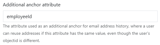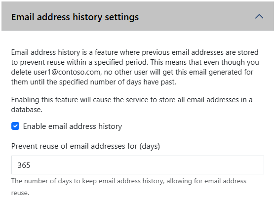If the email address history feature is not enabled, the new John Doe will be able to get john.doe@contoso.com as his email address, because there are no traces of that address being in use anywhere in the Contoso tenant. By configuring the email history feature in the admin panel, we can avoid this: