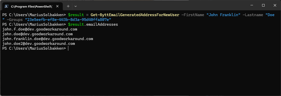 $result = Get-ByttEmailGeneratedAddressForNewUser -FirstName "John Franklin" -Lastname "Doe" -Groups "4cb1364b-d153-495e-8bb5-2d7108fd1415"